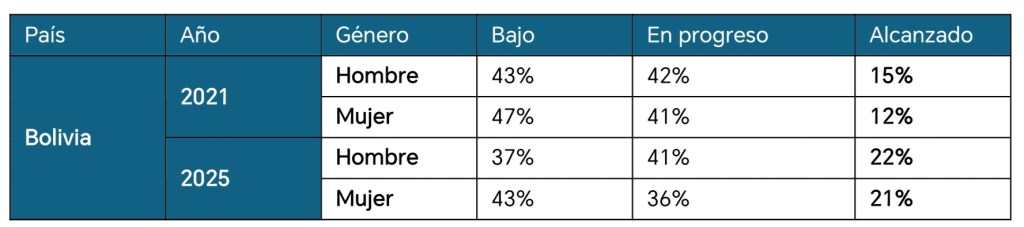 - El porcentaje de bolivianas en nivel alcanzado de inclusión financiera aumentó de 12% a 21% entre 2021 y 2025.